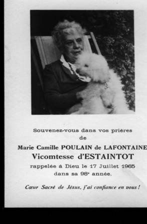 Elle est aussi connue sous le nom de Camille Poulain de Lafontaine 1, 2. Elle est aussi connue sous le nom de Marie Camille Poulain de Lafontaine, vicomtesse d'Estaintot 2. Elle est la fille de Poulain de la Fontaine 2.