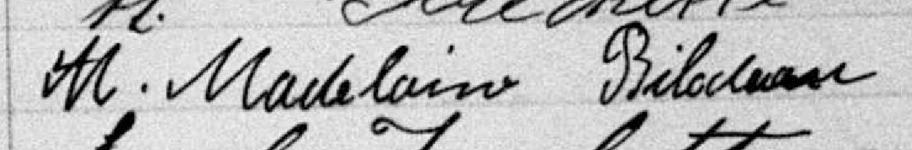 Elle est aussi connue sous le nom de Marie Magdeleine Bilodeau 1. Elle est aussi connue sous le nom de Marie-Magdeleine Bilodeau 2. Elle signe M. Madelaine Bilodeau 1. Elle signe M. Bilodeau 3. Elle signe Ma. Bilodau 2. Elle est aussi connue sous le nom de Madeleine Bilodeau 3, 4. Elle est la fille de Michel Bilodeau et Théotiste Gagne dite Bellavance.