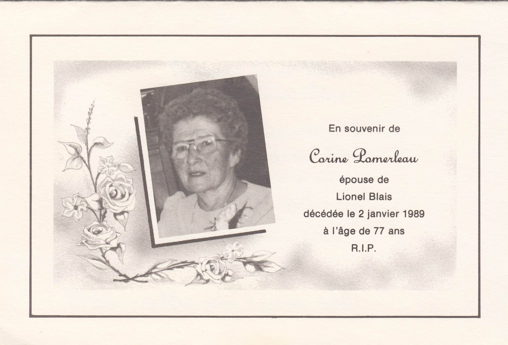 Elle naît le 4 novembre 1911 1. Elle épouse Lionel Blais 1. Elle décède le 2 janvier 1989 à Stanstead, Québec, Canada 1.
