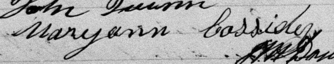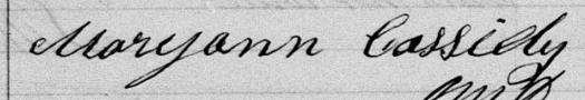 Elle est aussi connue sous le nom de Mary Cassidy 1. Elle est aussi connue sous le nom de Marianne Quinn 2. Elle est aussi connue sous le nom de Meryann Cassidy 3. Elle est aussi connue sous le nom de Mary Quinn 4. Elle est aussi connue sous le nom de Mary Ann Quinn 5. Elle est aussi connue sous le nom de Mary Ann Cassidy 6, 7. Elle est aussi connue sous le nom de Marianna Cassidy 8. Elle est aussi connue sous le nom de Mariann Cassidy 9. Elle est aussi connue sous le nom de Mary-Ann Casedy 10. Elle est aussi connue sous le nom de Mary Anne Cassidy 3, 11, 12, 13, 14, 15, 16, 17, 18, 19. Elle est baptisée Marie Anne Cassady 20. Elle signe Maryann Cassidy 11, 12, 15, 17, 19, 21, 22, 23, 24. Elle signe Maryan Cassidy 16. Elle est la fille de Patrice Cassady 16, 17, 20 et Marie Hating 17, 20. Elle est la filleule de Jane Patterson 20 et Timothee Madden 20.