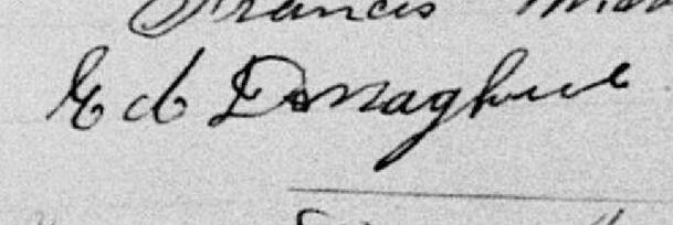 Il signe Ed Donaghue 1. Il est aussi connu sous le nom de Edward Donoghue 1, 2, 3. Il est baptisé Edouard Danyhey 4. Il signe Edward Donahue 5. Il est le fils de François Danyhey 4 et Anne McCluskey 4. Il est le filleul de Marie Donyhey 4 et James McClusky 4.