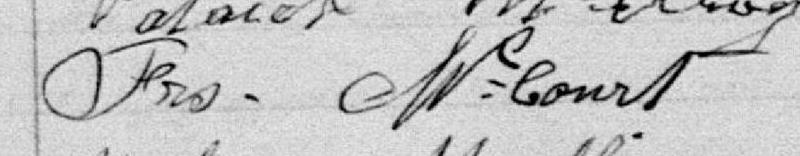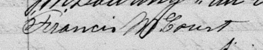 Il signe Frank McCourt 1, 2. Il est baptisé François McCourt 3, 4, 5. Il signe Francis McCourt 1, 6, 7, 8, 9, 10, 11, 12, 13, 14, 15, 16, 17, 18, 19, 20, 21, 22, 23, 24, 25, 26, 27, 28, 29, 30, 31, 32, 33, 34, 35, 36, 37, 38, 39, 40, 41, 42, 43, 44, 45, 46, 47, 48, 49, 50, 51, 52, 53, 54. Il est le fils de Patrice McCourt 3, 14 et Helena Mullavy 3, 14. Il est le filleul de Marguerite McCourt 3 et François McCourt 3.