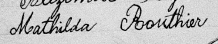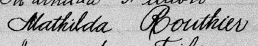 Elle est aussi connue sous le nom de Mathilda Routier 1. Elle est aussi connue sous le nom de Mathilda Routhier 2, 3. Elle est aussi connue sous le nom de Matilda Routhier 4. Elle est baptisée Marie Mathilda Routier 5. Elle est la fille de Olivier Routhier 5 et Marie Olympe Blais 5. Elle est la filleule de Philomène Gosselin 5 et Pierre Ferdinand Pageot 5.