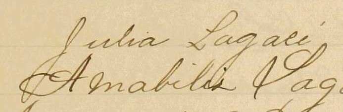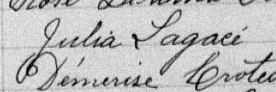 Elle est aussi connue sous le nom de Julia Lagacé 1, 2, 3. Elle est aussi connue sous le nom de Julia Lagasse 4. Elle est aussi connue sous le nom de Julia Lagace 5. Elle est baptisée Marie Julie Antoinette Migné 6. Elle est la fille de Paul Migné dit Lagacé 3, 6 et Délima Payer 3, 6. Elle est la filleule de Domitille Payer 6 et Augustin Rousseau 6.