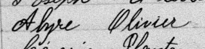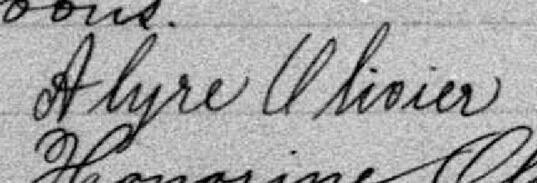 Il est aussi connu sous le nom de Alire Olivier 1, 2, 3. Il est aussi connu sous le nom de Alyre Olivier 2, 3, 4, 5, 6, 7, 8, 9. Il est aussi connu sous le nom de Joseph Alyre Olivier 6. Il est baptisé Joseph Aline Olivier 10. Il est le fils de Polycarpe Olivier 6, 10 et Marie Olive Demers 6, 10. Il est le filleul de Marie Julie Demers 10 et Honoré Frechet 10.
