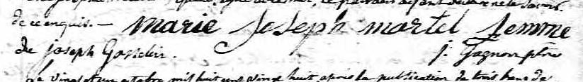Elle est aussi connue sous le nom de Marie-Josephte Martel. Elle est aussi connue sous le nom de Josette Martel 1. Elle est aussi connue sous le nom de Marie Martel 2. Elle est aussi connue sous le nom de Marie Josephte Martel 3. Elle est aussi connue sous le nom de Marie Josette Martel 4. Elle est aussi connue sous le nom de Josephte Martel 5, 6, 7. Elle signe Marie Joseph Martel 3, 4. Elle est la fille de Ignace Martel et Angélique Crepeau.