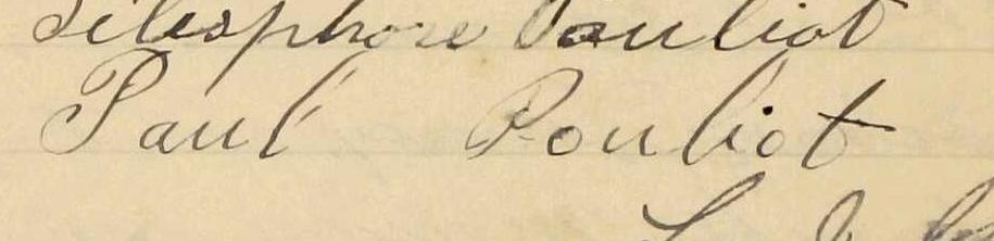 Il est aussi connu sous le nom de Paul Pouliot 1, 2, 3, 4, 5, 6, 7, 8, 9, 10, 11, 12, 13, 14, 15, 16, 17. Il est baptisé Napoléon Pouliot 18, 19. Il est le fils de Jérémie Pouliot 3, 18 et Philomène Pouliot 3, 18. Il est le filleul de Marie Philomène Marceau 18 et François Xavier Vaillancourt 18.