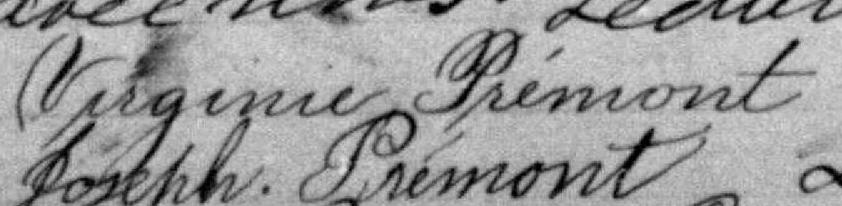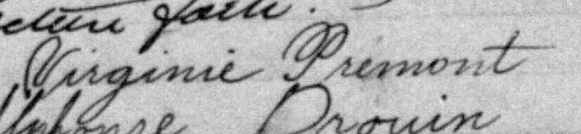 Elle est aussi connue sous le nom de M Virginie Premont 1. Elle est aussi connue sous le nom de Marie Virginie Prémont 2, 3. Elle est baptisée Marie Virginie Florida Prémont 4. Elle signe Virginie Prémont 2, 3, 5. Elle est la fille de Jean-Baptiste Prémont 4 et Marie Eléonore Asselin 4. Elle est la filleule de Marie Virginie Asselin 4 et Joseph Primont 4.
