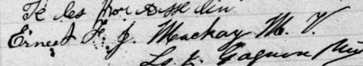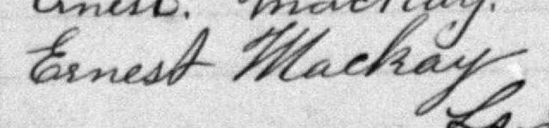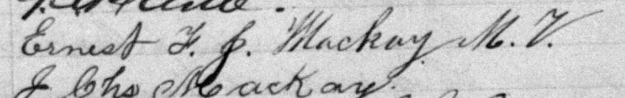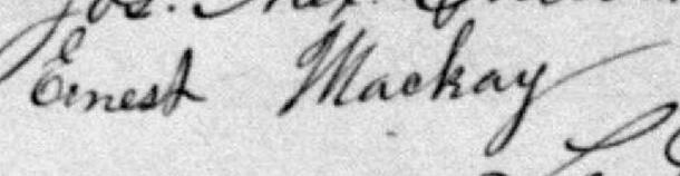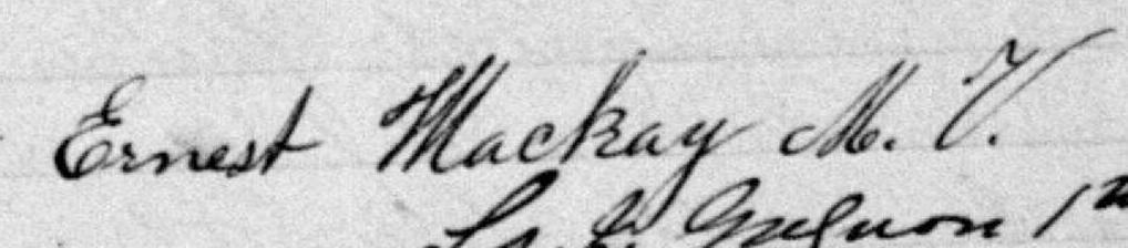 Il est aussi connu sous le nom de Ernest McKay. Il est aussi connu sous le nom de Écuyer Ernest MacKay 1. Il est aussi connu sous le nom de Ernest Mackay 2, 3, 4, 5, 6, 7, 8. Il signe Ernest Mackay M. V. 1, 5. Il signe Ernest F. J. Mackay M. V. 4, 6. Il est le fils de Stephen McKay et Euchar Pinet.