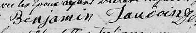 Il est aussi connu sous le nom de Benjamin Jaudoin 1, 2, 3, 4, 5, 6, 7, 8, 9, 10, 11, 12. Il est aussi connu sous le nom de Binjamin Jodoin 2, 13, 14, 15, 16, 17, 18. Il est aussi connu sous le nom de Binjamin Jodouin 6, 9, 15, 17, 19, 20, 21, 22. Il est aussi connu sous le nom de Benjamin Jodouin 5, 7, 8, 10, 12, 23, 24, 25, 26, 27, 28, 29, 30, 31, 32, 33, 34, 35, 36, 37, 38, 39, 40. Il signe Benjmain Jaudoin 19. Il signe B Jaudoin 23. Il signe Benjam Jaudoin pere 14. Il signe Be. Jaudoin 25. Il est aussi connu sous le nom de Benjamin Jodoin 3, 11, 15, 16, 17, 18, 20, 21, 22, 24, 26, 29, 30, 31, 33, 39, 41, 42, 43, 44, 45, 46, 47, 48, 49, 50, 51, 52, 53, 54, 55, 56, 57, 58, 59, 60. Il est le fils de Augustin Jodoin 5, 13, 19, 22, 23, 43, 44, 47, 48, 52, 55, 56 et Anne Perrot dite Duchesne 44.