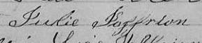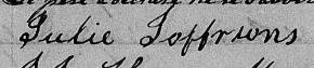 Elle est aussi connue sous le nom de Julie Géoffrion 1. Elle est aussi connue sous le nom de Julie Joffriand 2. Elle est aussi connue sous le nom de Julie Geoffrion 3, 4, 5, 6, 7. Elle est aussi connue sous le nom de Julie Joffrion 8. Elle est aussi connue sous le nom de Julie Mongeon 9. Elle est baptisée Marie Julie Geoffrion 10. Elle signe Julie Joffrions 2.