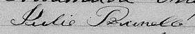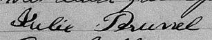 Louis Brunel, Céleste Brunel, Julie Brunel, Julie Jaret et Louis Brunelle résident dans une maison de bois de 1 étage à Sainte-Anne, Varennes, Verchères, Québec en 1851 20. Azélie Bienvenu, Julie Brunel, Louis Brunel, Julie Jaret et Louis Brunelle résident dans une maison en bois de 1 étage sur le rang de la Butte-aux-Renards sur une terre de 125 arpents d'une valeur de 3500$ dont 40 arpents en pâturage, 35 arpents non cultivés, 1 arpent en jardin ou verger ayant produit pour une valeur de 5$, 90 arpents en culture, dont 1,5 arpents en production de blé de printemps ayant produit 15 minots, dont 10 arpents en production d'orge ayant produit 150 minots, dont 15 arpents en production d'avoine ayant produit 200 minots, dont 0,25 arpent en production de pommes de terre ayant produit 25 minots et dont 9 arpents en production de pois ayant produit 60 minots dans la paroisse de Varennes, Varennes en 1861 21, 22. Julie Brunel est de religion catholique de 1861 à 1901 1, 2, 8, 9, 10. Julie Jaret, Julie Brunel et Louis Brunelle résident sur un terrain de 115 arpents avec 1 maison et 3 bâtiments agricoles sur le rang de la Butte-aux-Renards sur une terre de 90 arpents dont 34 arpents en pâturage, 90 arpents en valeur, 0,25 arpent en jardin ou verger ayant produit 62 minots d'orge, 370 minots d'avoine, 1,5 minots de maïs, 116 minots de pois, 0,5 minot de feves, 1,5 minots de lin, 24 livres de tabac, 1 minot d'autre fruits, 6 arpents en production de blé ayant produit 33 minots de blé de printemps, 0,25 arpent en production de pommes de terre ayant produit 4 minots et 9 arpents en production de foin ayant produit 800 bottes à Varennes en 1871 23, 24, 25. Elle est d'origine ethnique française de 1871 à 1901 2, 8, 10. Julie Brunel réside à Sainte-Anne, Varennes en 1872 3. Julie Brunel et Pierre Geoffrion résident à Varennes en 1881 47. Julie Brunel et Pierre Geoffrion résident à Sainte-Anne, Varennes en 1883 7. Julie Brunel et Julie Jaret résident dans une maison de bois d'un étage de 3 pièces dans le village de Varennes, Verchères en 1891 48. Elle sait lire et écrire de 1891 à 1901 9, 10. Elle canadienne en 1901 10. Elle parle français et anglais en 1901 10. Julie Brunel réside sur 1 lot de ville avec 1 maison de 6 chambres dans le village, Varennes, Chambly et Verchères, Québec en avril 1901 49, 50.