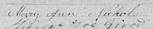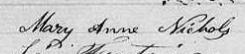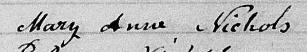 Elle est aussi connue sous le nom de Marie-Anne Nichols 1. Elle est aussi connue sous le nom de Marianne Nichols 2. Elle est aussi connue sous le nom de Marie Nichols 3, 4, 5, 6, 7, 8. Elle est aussi connue sous le nom de Marry Anne Nichols 9. Elle est aussi connue sous le nom de Mary-Anne Nichols 10. Elle est baptisée Marie Anne Nichols 11, 12. Elle signe Mary Nichols 1, 3. Elle signe Mary Ann Fontain 2. Elle signe Mary Anne Nichols 12, 13. Elle est la fille de Sieur Livy Nichols 1, 11 et Dame Mary Perrors 1, 11. Elle est la filleule de Dame Zoé Ainse-Girod 11 et Sieur Parkins Nicols 11.