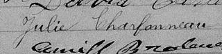 Elle est aussi connue sous le nom de J. Charbonneau 1. Elle est aussi connue sous le nom de Julie Girard 2. Elle est baptisée Julie Charbonneau 3, 4, 5, 6, 7, 8, 9, 10, 11, 12, 13, 14, 15, 16, 17, 18, 19, 20, 21, 22, 23, 24, 25, 26, 27, 28, 29. Elle est la fille de Jean Baptiste Charbonneau 3, 19 et Julie Bourg 3, 19. Elle est la filleule de Céleste Bréard 3 et Jean Collet 3.