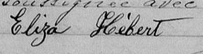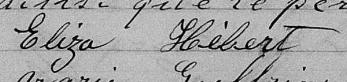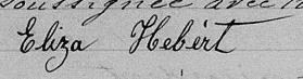 Elle est aussi connue sous le nom de Eliza Hébert 1, 2, 3, 4, 5, 6, 7, 8, 9, 10, 11. Elle est aussi connue sous le nom de J. Eliza Hébert 12. Elle est aussi connue sous le nom de Eliza Hebert 13, 14. Elle est aussi connue sous le nom de Eliza Hébrt 15. Elle est aussi connue sous le nom de Eliza Choquet 16, 17. Elle est aussi connue sous le nom de Eliza Choquette 18. Elle est baptisée Marie Elisa Hébert 19. Elle signe Elisa Hébert 4, 11, 20, 21, 22, 23, 24, 25. Elle est la fille de Joseph Hébert 3, 19 et Marie Magdeleine Lussier 3, 19. Elle est la filleule de Justine Jodouin 19 et Pierre Geoffrion 19.