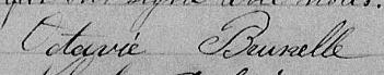 Elle est aussi connue sous le nom de Octavie Brunel 1, 2, 3. Elle est baptisée Marguerite Tarcille Octavie Brunel 4. Elle signe Octavie Brunelle 1, 2, 5, 6, 7. Elle est la fille de Théophile Brunelle 4, 7 et Marguerite Birtz 4, 7. Elle est la filleule de Charlotte Jodoin 4 et Pierre Birtz 4.