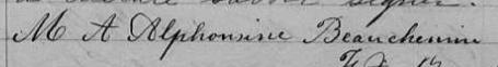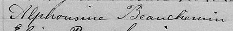 Elle est aussi connue sous le nom de Aphonsine Beauchemin 1, 2, 3. Elle est aussi connue sous le nom de Marie Anne Alphonsine Beauchemin 4. Elle est aussi connue sous le nom de Alphonsine Bauchemin 5. Elle est aussi connue sous le nom de Alphonsine Beuachemin 6. Elle est aussi connue sous le nom de Alphonsine Beauchemin 7, 8. Elle est baptisée Louise Alphonsine Petit 9. Elle signe M A Alphonsine Beauchemin 4. Elle est la fille de Joseph Petit 2, 9 et Marie Elie Collet 2, 9. Elle est la filleule de Marie Zoë Collet 9 et Louis Paré 9.