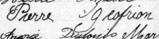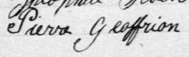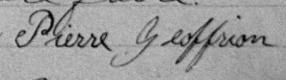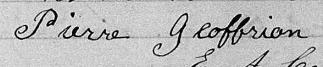 Il est aussi connu sous le nom de Pierre Geoffrion fils 1. Il est baptisé Pierre Geoffrion 1, 2, 3, 4, 5, 6, 7, 8, 9, 10, 11, 12, 13, 14, 15, 16, 17, 18, 19, 20, 21, 22, 23, 24, 25, 26. Il signe Pierre Geofrion 9. Il est le fils de Pierre Geoffrion 2, 6, 9 et Marie Céleste Mongeau 2, 9. Il est le filleul de Dorothée Jodouin 2 et Louis Geoffrion 2.