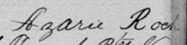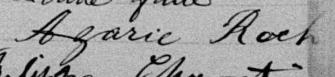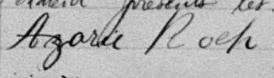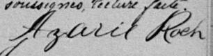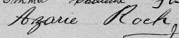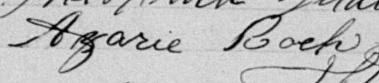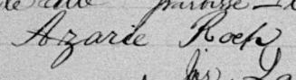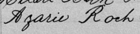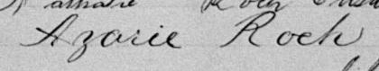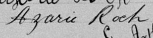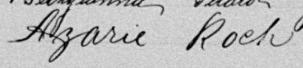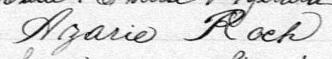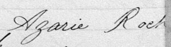 Il est aussi connu sous le nom de Azarie Rock 1, 2. Il est aussi connu sous le nom de Azarie Roch 3, 4, 5, 6, 7, 8, 9, 10, 11, 12, 13, 14, 15, 16, 17, 18, 19, 20, 21, 22, 23, 24, 25, 26, 27, 28, 29, 30, 31, 32, 33, 34, 35, 36, 37, 38, 39, 40. Il est baptisé Marie Roch 41. Il est le fils de Louis René Roque 5, 41 et Julie Brunelle 5, 41. Il est le filleul de Emélie Girard 41 et Louis Brunelle 41.