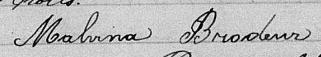 Elle est aussi connue sous le nom de M. Brodeur 1. Elle est aussi connue sous le nom de Malvina Brodeur 2, 3, 4, 5, 6. Elle est aussi connue sous le nom de Melina Brodeur 7. Elle est aussi connue sous le nom de Marie Malvina Brodeur 5, 8. Elle est baptisée Marie Malvina Louise Brodeur 9. Elle est la fille de Honoré Brodeur 9 et Octavie Mongeau 9. Elle est la filleule de Josephte Choquet 9 et Pierre Geoffrion 9.