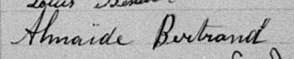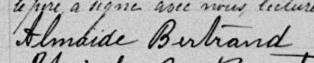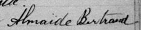 Elle est aussi connue sous le nom de Almaïde Bertrand 1, 2, 3, 4, 5, 6, 7, 8, 9, 10, 11, 12, 13, 14, 15, 16, 17, 18, 19, 20, 21, 22, 23, 24, 25. Elle est aussi connue sous le nom de Elmaide Bertrand 26. Elle est aussi connue sous le nom de Marie Almaïde Bertrand 3. Elle est aussi connue sous le nom de Elmaïde Petit 27. Elle est aussi connue sous le nom de Armaïde Bertrand 28. Elle est aussi connue sous le nom de Almede Bertrand 15. Elle est aussi connue sous le nom de Almaïde Petit 29. Elle est baptisée Marie Louise Adélaide Bertrand 30. Elle est la fille de François Xavier Bertrand 3, 30 et Louise Bertrand 3, 30. Elle est la filleule de Elmire Danserau 30 et Louis Bertrand 30.
