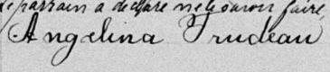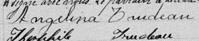 Elle est aussi connue sous le nom de Angélina Trudeau 1, 2, 3, 4, 5, 6, 7, 8, 9, 10, 11, 12, 13. Elle est aussi connue sous le nom de Angéline Trudeau 14. Elle est aussi connue sous le nom de Angélina Petit 15, 16. Elle est aussi connue sous le nom de Angelina Trudeau 2, 3, 5, 8, 17, 18, 19, 20, 21. Elle est la fille de Theophile Trudeau 2 et Asille Blain 2.