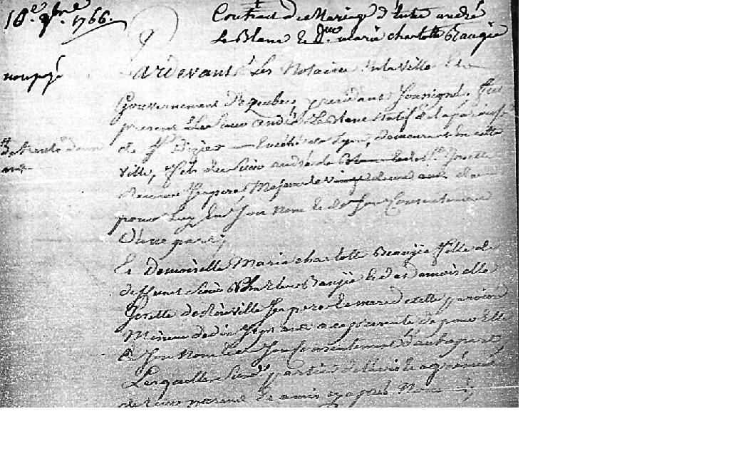 Elle naît le premier mars 1748 à Notre-Dame, Québec, Capitale-Nationale, Québec, Canada 6, 7. Elle est baptisée le 2 mars 1748 à Québec 3. Sieur André Le Blanc et Marie-Charlotte Beaugis signent un contrat de mariage le 10 novembre 1766 8