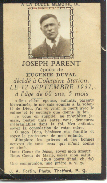 Il naît en avril 1877 4. Il épouse Eugénie Duval fille de Anaïsse Avoine et Amable Duval le 11 mai 1897 Saint-Alphonse, Thetford-Mines, Québec, Canada en présence de Sylvie Nadeau, Amable Duval, François Parent et Hubert Parent, le mariage est célébré par Louis Gosselin 2. Il décède le 12 septembre 1937 à Coleraine-Station, Chaudière-Appalaches, Québec 4. Liste de ses enfants connus: