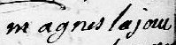 Elle est aussi connue sous le nom de Marie-Agnès De la Joue 1. Elle est aussi connue sous le nom de Marie Lajoue 2. Elle est la fille de François de la Joue 3 et Marie Mesnage 3.