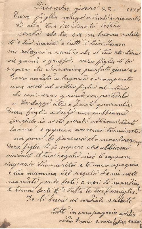 Maria Mazzoni reçoit une lettre le 22 décembre 1889 de Prudenza Mutti 1