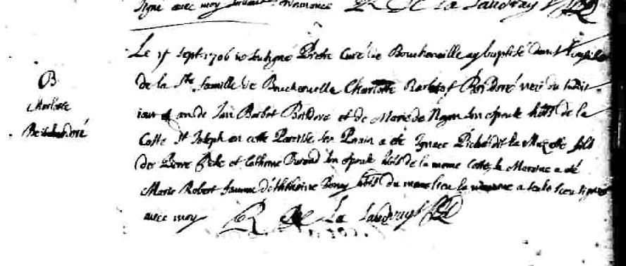 Il est présent lors du baptême de Charlotte Barbeau le 15 septembre 1706 à Boucherville, Montérégie, Québec par Rodolphe Delasaudrays 5