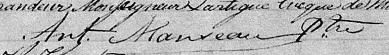Il est aussi connu sous le nom de Ant. Manseau 1. Il est aussi connu sous le nom de Manseau 2. Il signe Ant. Manseau Pte 1. Il signe Ant. Manseau Ptre 2, 3, 4. Il est aussi connu sous le nom de Antoine Manseau 4, 5. Il est aussi connu sous le nom de Antoine Robidas 6. Il est le fils de Antoine Manseau 5 et Marie Côté 5.