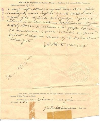 214. Note de Gérard Lehoux - 21 septembre 2015, selon les registres de Saint-Fortunat-de-Wolfestown, 1904, p. 12, B61