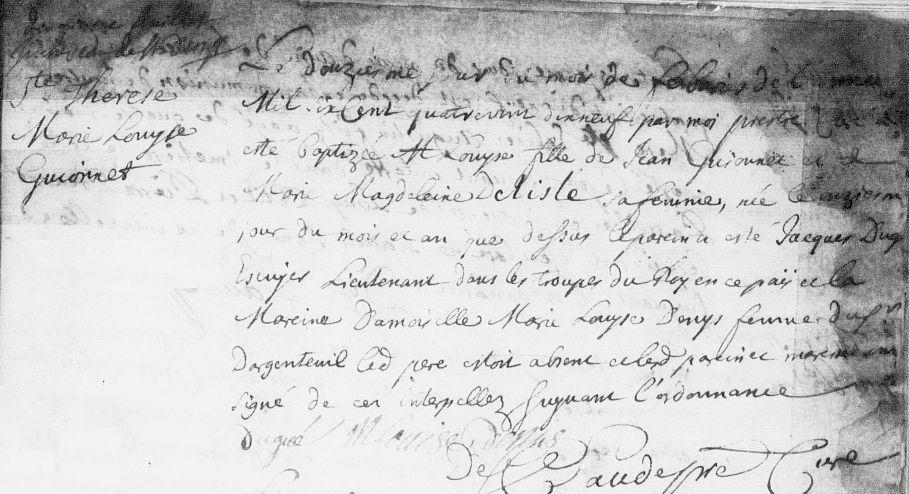 Elle est présente lors du baptême de Louise Dionet le 2 février 1699 à Montréal, Île de Montréal, Québec par Claude Vollant 11, 12, 13, 14