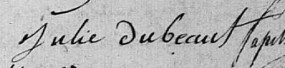 Elle est aussi connue sous le nom de Julie Dubaut 1. Elle est aussi connue sous le nom de Julie Dubeau 1. Elle est aussi connue sous le nom de Julie Dubost 1. Elle est aussi connue sous le nom de Julien Dubeau 2. Elle est aussi connue sous le nom de Julie Dabeau 3. Elle signe Julie Dubeaut 3, 4. Elle est la fille de Joseph Dubost 1 et Marie Lebas 1.