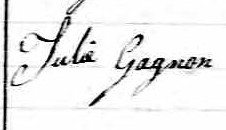 Elle signe Julie Gagnon 1, 2, 3, 4, 5, 6, 7, 8, 9. Elle est la fille de Bénoni Gagnon et Marguerite Larochelle.