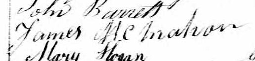 Michael Hogan, Bridget Hogan, James McMahon, John Cartey, Ann Pheley et James Pheley résident dans une maison pièces sur pièces d'un étage à Saint-Sylvestre, Chaudière-Appalaches, Québec, Canada en 1852 1. Bridget Hogan et James McMahon résident dans une maison pièces sur pièces d'un étage sur le lot 21, une terre d'une valeur de $300 de 90 arpents dont 16 arpents en pâturage et 14 arpents en culture, dont 1 arpent a produit 10 minots de blé, 1 arpent a produit 20 minots d'orge, 5 arpents ont produit 125 minots d'avoine, 1 arpent a produit 60 minots de pommes de terre et le reste 3 tonnes de foin à Saint-Frederick, Saint-Sylvestre, Lotbinière, Canada-Est, Canada en 1861 6. James McMahon possède $11 d'instruments aratoires, 2 bovins de 3 ans ou plus, 3 bovins de moins de 3 ans, 2 vaches laitières, un cheval de 3 ans ou plus d'une valeur de $56, 5 moutons et 7 porcs d'une valeur totale pour tout le bétail de $145 ayant produit 8 livres de laine, 7 verges d'étoffe, 100 livres de beurre et 2 barils de viande de porc en 1861 6. James McMahon est cultivateur de 1861 à 1879 6, 7, 8, 9. Bridget Hogan et James McMahon résident à Saint-Sylvestre, Saint-Sylvestre de 1870 à 1879 5, 7. Alphront Lafrance, Bridget Hogan et James McMahon résident sur un terrain de 90 arpents avec 1 maison et 1 bâtiment agricole dans la concession Saint-Frederick sur une terre de 90 arpents dont 20 arpents en pâturage, 50 arpents en valeur ayant produit 150 minots d'avoine, 40 minots de sarrasin, 100 livres de sucre d'érable, 2 arpents en production de blé ayant produit 15 minots de blé de printemps, 1 arpent en production de pommes de terre ayant produit 200 minots et 12 arpents en production de foin ayant produit 1600 bottes à Saint-Sylvestre en 1871 13, 14, 15. James McMahon possède 1 carriole, 3 charettes et 1 charrue en 1871 14. James McMahon possède 1 cheval, 9 moutons (4 ont été tué l'an passé) ayant produit 27 livres de laine, 4 vaches ayant produit 300 livres de beurre, 3 porcs (3 ont été tué l'an passé) et 5 autres bêtes en 1871 16. James McMahon est de religion catholique en 1871 8. James McMahon a produit de la viande de 3 boeufs, 33 verges de drap et 16 verges de toile en 1871 16. James McMahon a produit 26 cordes de bois de chauffage en 1871 17. Il est d'origine ethnique irlandaise en 1871 8. Il est analphabète en 1871 8.