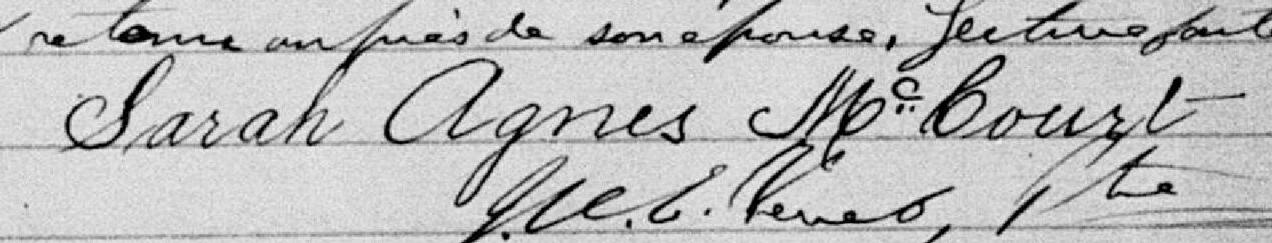Elle est aussi connue sous le nom de Sarah McCourt 1. Elle est aussi connue sous le nom de Ann McCourt 2. Elle est aussi connue sous le nom de Sarah Agnes McCourt 3, 4, 5. Elle est aussi connue sous le nom de Agnes McCourt 4. Elle est baptisée Sarah Anne McCourt 6. Elle est la fille de Michael McCarte 6 et Mary Galvin 6. Elle est la filleule de Margaret Blaney 6 et James McCourt 6.