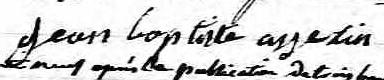 Il est aussi connu sous le nom de Jean Baptiste Asselin 1, 2, 3, 4, 5, 6, 7, 8, 9, 10, 11, 12, 13, 14, 15, 16, 17, 18, 19, 20, 21, 22, 23, 24, 25, 26, 27, 28. Il est aussi connu sous le nom de Jean-Baptiste Asselin 3, 6, 7, 10, 11, 15, 16, 18, 29, 30, 31, 32, 33, 34, 35, 36, 37, 38, 39, 40, 41, 42, 43, 44. Il est aussi connu sous le nom de Jean B. Asselin 45. Il signe Jean Baptistes Asselin 2, 30. Il signe Jean Bapt. Asselin 43. Il est le fils de Charles-François Asselin 3, 8, 9, 16 et Marie-Abondance Loiseau 3.