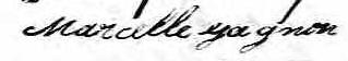 Il est aussi connu sous le nom de Marcel Gagnon 1, 2, 3, 4, 5, 6, 7, 8, 9, 10, 11. Il est aussi connu sous le nom de Marsel Gagnon 12. Il est baptisé Joachin-Marcelle Gagnon 13. Il signe Marcelle Gagnon 6, 7.
