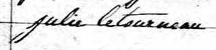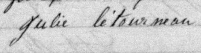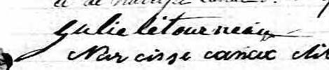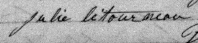 Elle est aussi connue sous le nom de Julie Létourneau 1, 2, 3, 4, 5, 6, 7, 8. Elle est aussi connue sous le nom de Marie-Julie Letourneau. Elle est baptisée Marie Julie Létourneau 9, 10. Elle signe Julie Letourneau 5, 11.
