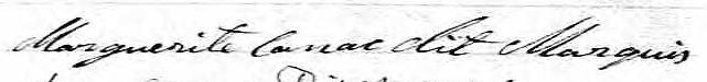 Elle est aussi connue sous le nom de Marguerite Canac dite Marquis 1, 2. Elle est aussi connue sous le nom de Marguerite Marquis 3. Elle est aussi connue sous le nom de Marguerite 4. Elle est baptisée Marguerite Canac 5, 6. Elle est la fille de Jean Canac dit Marquis 2, 5 et Thérèse Deblois 2, 5. Elle est la filleule de Céleste Hébert 5 et Francois Côté 5.