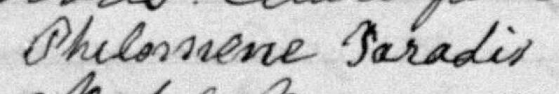 Elle est aussi connue sous le nom de Philomène Paradis 1, 2, 3, 4, 5, 6, 7, 8, 9, 10, 11, 12, 13, 14, 15, 16, 17, 18, 19, 20, 21, 22, 23, 24, 25, 26, 27, 28, 29, 30, 31, 32, 33. Elle est aussi connue sous le nom de Philomène Marquis 34, 35, 36, 37. Elle est aussi connue sous le nom de Dame Philomène Paradis 38. Elle est aussi connue sous le nom de Marie Philomène Paradis 39. Elle est baptisée Mari Philomène Paradis 40, 41. Elle signe Philomene Paradis 12, 33. Elle signe Marie Philme Paradis 39. Elle est la fille de Ignace Paradis 3, 40 et Marguerite Baucher dite Morency 3, 40. Elle est la filleule de Brigitte Létourneau 40 et Joseph Baucher dit Morency 40.