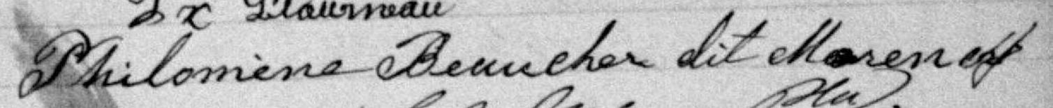 Elle est aussi connue sous le nom de Philomène Morency 1, 2, 3, 4, 5. Elle est aussi connue sous le nom de Philomène Baucher dite Morency 6, 7, 8, 9, 10, 11, 12, 13, 14. Elle est aussi connue sous le nom de Philomène Beaucher 7, 8, 15. Elle est aussi connue sous le nom de Philomène Baucher 16, 17, 18. Elle est aussi connue sous le nom de Philomène Baucher dite Morenci 19. Elle est aussi connue sous le nom de Philomène Létourneau 20, 21, 22. Elle est aussi connue sous le nom de Dame Philomène Beaucher dite Morency 23, 24. Elle est aussi connue sous le nom de Philomène Letourneau 25. Elle est baptisée Marie Philomene Boscher 26. Elle signe Philomène Beaucher dite Morency 16, 24, 27, 28, 29, 30, 31, 32, 33, 34, 35, 36, 37, 38, 39, 40, 41, 42, 43. Elle est la fille de Augustin Baucher dit Morency 7, 26 et Marguerite Asselin 7, 26. Elle est la filleule de Marie Baucher dite Morency 26 et François Xavier Asselin 26.