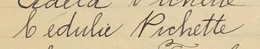 Elle est aussi connue sous le nom de Cedulia Pichette 1. Elle est aussi connue sous le nom de Cédulie Pichette 2. Elle est aussi connue sous le nom de Cédulie Pîchette 3. Elle est baptisée Marie Sedulia Pichet 4.