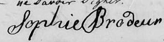 Elle est aussi connue sous le nom de Sophie Brodeur 1, 2, 3, 4, 5, 6, 7, 8, 9, 10, 11, 12, 13, 14. Elle est aussi connue sous le nom de Demoiselle Sophie Brodeur 8. Elle est baptisée Marie Sophie Brodeur 15.