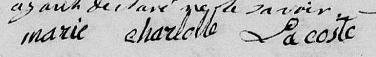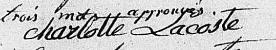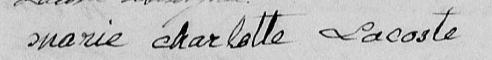 Elle est aussi connue sous le nom de Josette Lacoste. Elle est aussi connue sous le nom de Charlotte Lacoste 1, 2, 3, 4, 5, 6, 7, 8, 9, 10, 11, 12, 13, 14, 15, 16, 17, 18, 19, 20, 21, 22, 23, 24, 25, 26, 27, 28, 29, 30, 31, 32, 33, 34, 35, 36. Elle est aussi connue sous le nom de Charlotte Lacâsse 37. Elle est aussi connue sous le nom de Charles Lacoste 8. Elle est aussi connue sous le nom de Charlotte Languedoc 38. Elle est aussi connue sous le nom de Charlotte Lacoste dite Languedoc 39. Elle est aussi connue sous le nom de Elizabeth Lacoste 40. Elle signe Mari Charlotte Lacoste 9, 13. Elle signe Marie Charlotte Lacoste 18, 41, 42, 43, 44, 45, 46, 47, 48.