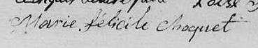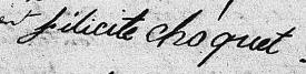 Elle est aussi connue sous le nom de Félicite Choquet 1, 2, 3. Elle est aussi connue sous le nom de Félite Choquet 4. Elle est aussi connue sous le nom de Marie Felicite Choquêt 5. Elle est aussi connue sous le nom de Marïe Félicite Choquet 6. Elle est aussi connue sous le nom de Marie Félicile Choquet 7. Elle est aussi connue sous le nom de Marie Choquet 8, 9. Elle signe Marie Félcite Choquet 10. Elle signe M. F. Choquet 11. Elle signe M e e t Choquet 5. Elle est aussi connue sous le nom de Marie Félicite Choquet 8, 9, 10, 11, 12, 13. Elle est la fille de Joseph Choquet 10 et Madeleine Jodoin.