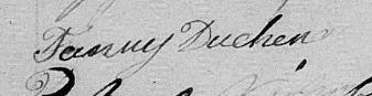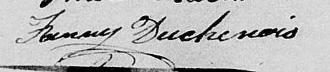 Elle est aussi connue sous le nom de Demoiselle Fanny Ainse 1. Elle est aussi connue sous le nom de Françoise Ainse 2, 3. Elle est aussi connue sous le nom de Dame Francoise Ainse 4, 5. Elle est aussi connue sous le nom de Dame Duchenois 6. Elle est aussi connue sous le nom de Dame Francoise Ainsse 7. Elle est aussi connue sous le nom de Dame Françoise Duchénois Ainsse 8. Elle est aussi connue sous le nom de Dame Françoise Ainsse 9. Elle est aussi connue sous le nom de Dame Thérèse Ainse 10. Elle est aussi connue sous le nom de Dame Françoise Ainse 11, 12, 13, 14, 15, 16. Elle est aussi connue sous le nom de Dame Françoise Aine 17. Elle est aussi connue sous le nom de Françoise Hainsse. Elle est aussi connue sous le nom de Thérèse Ainse 18. Elle est baptisée Francoise Ainse 19. Elle signe Fanny Ainse 1, 2. Elle signe Fanny Duchenois 6, 20. Elle signe Fanny Duchene 8. Elle est la fille de Joseph Bernard 2, 19 et Therese Guermier Laviolette 2, 19. Elle est la filleule de Suzanne Godefroy 19 et Jean Pierre Guermier Laviolette Antoine 19.