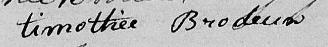 Il est aussi connu sous le nom de Sieur Timothé Brodeur 1, 2. Il est aussi connu sous le nom de Timothée Brodeur 3, 4, 5, 6, 7, 8, 9, 10, 11, 12, 13. Il est aussi connu sous le nom de Thimothé Brodeur 8, 9, 14, 15. Il est aussi connu sous le nom de Timothé Brodeur 16. Il est aussi connu sous le nom de Écuyer Thimothé Brodeur 17. Il est baptisé Thimothée Brodeur 18. Il signe Thimothée Brodeur 3. Il signe T Brodeur 1, 2, 13, 14, 15, 17, 19. Il est le fils de Toussaint Brodeur dit Lavigne 1, 9, 10, 13, 14, 16, 18 et Archange Fournier dite Préfontaine 1, 18. Il est le filleul de Marie-Apolline Savaria 18 et Christophe Brodeur 18.